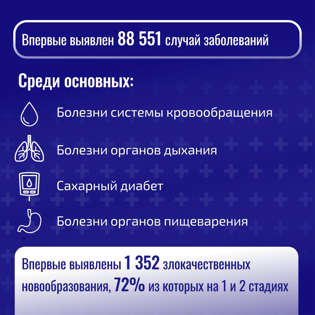 В Новосибирской области в 2025 году первый этап диспансеризации и профосмотры прошли порядка 1,2 млн человек, своевременно выявлены более 88,5 тыс. новых случаев заболеваний. Большинство из них – болезни системы кровообращения, в том числе связанные с повышенным артериальным давлением, болезни органов дыхания и сахарный диабет. Также удалось выявить злокачественные новообразования, 72 % – на ранних стадиях.