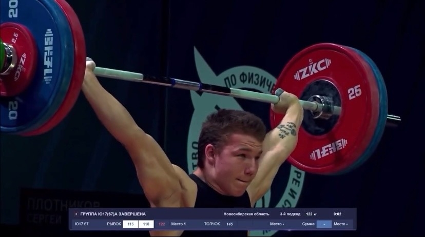 Буквально вчера спортсмен обновил рекорд России в рывке в весовой категории 67 кг, 17 лет — 122 кг!