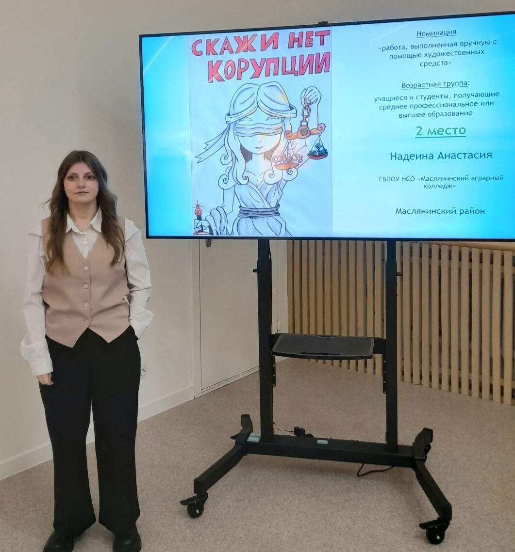На муниципальном этапе в центр правовой информации Маслянинской центральной библиотеки поступило 13 работ учащихся Маслянинского аграрного колледжа. Работа Надеиной Анастасии была признана победителем муниципального этапа творческого конкурса «Страна без коррупции».