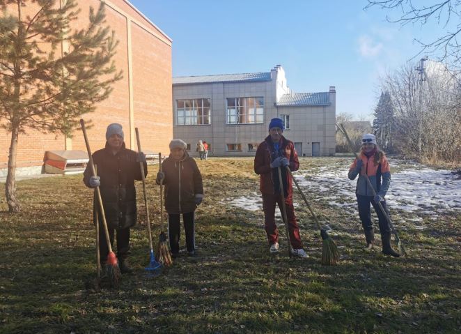 Сегодня на улице прекрасная погода. Сотрудники спортивно-оздоровительного комплекса дружно вышли на субботник!Фото Екатерины Чудиновой
