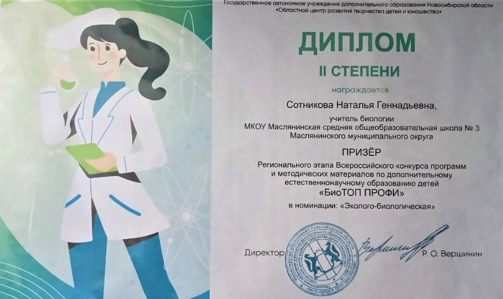 Дипломом II степени награждена Наталья Геннадьевна Сотникова, учитель биологии Маслянинской школы № 3, педагог дополнительного образования, ПРИЗЁР регионального этапа Всероссийского конкурса программ и методических материалов по дополнительному и естественнонаучному образованию детей «БиоТОП ПРОФИ» в номинации «эколого-биологическая»