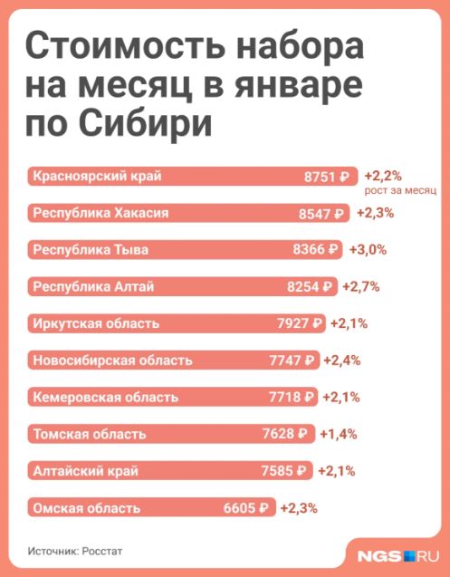 В Новосибирской области стоимость условного (минимального) набора продуктов питания в январе 2026 года составила почти 8 тысяч рублей — 7746,52 рубля. Об этом сообщает пресс-служба Новосибирскстата.По сравнению с предыдущими месяцами стоимость увеличилась на +2,4%. В структуре стоимости продуктового набора преобладают […]