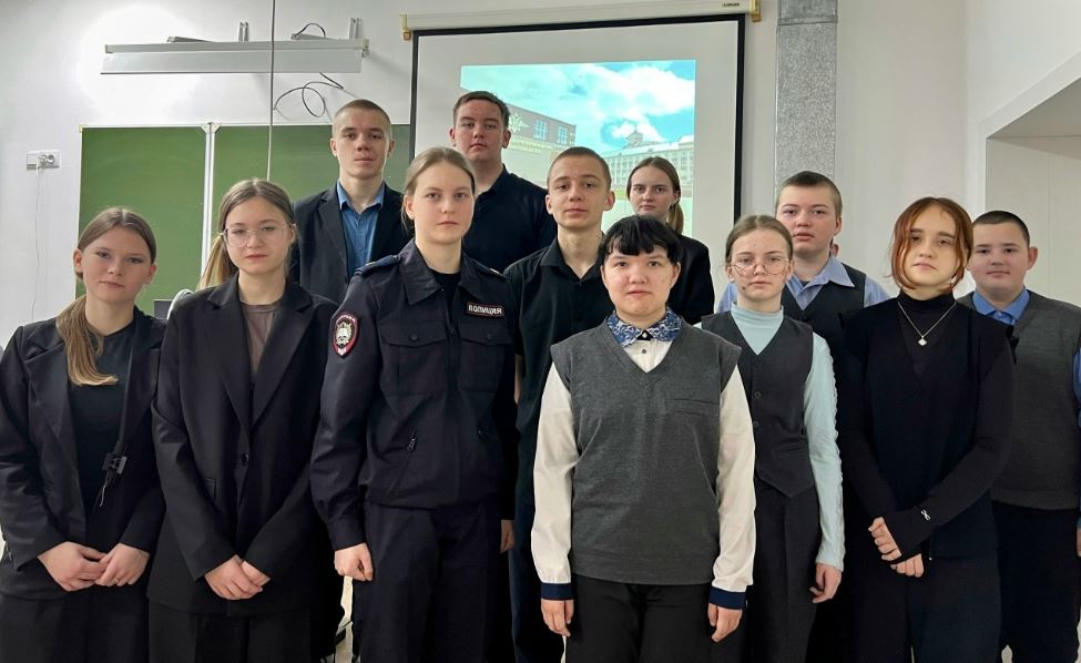 В школу пришла выпускница, ныне курсант Барнаульского юридического института МВД России Анна Шипуновская. Во время встречи Аня поделилась с учениками своим опытом. Она рассказала как подготовиться к поступлению в вуз МВД, как проходит учеба и жизнь курсанта и какие перспективы открываются после окончания института.